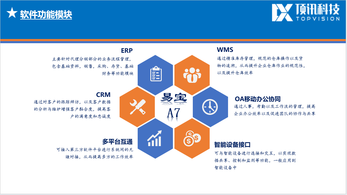 今年12月,頂訊將發布的新一代管理系統——易寶A7,其融入了AI、云計算、5G、大數據,可以更好地服務于半導體分銷商的個性化的需求,比如如何抓潛在客戶、如何分析趨勢。具體來看,易寶A7將涵蓋ERP、WMS、OA移動辦公協同、智能設備接口、多平臺互通。敬請期待!